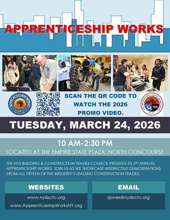 The New York State Building and Construction Trades Council hosts an annual Apprenticeship Works event in Albany each year where all the union building trades demonstrate their crafts, interact with students, the community, as well as legislators from around New York State. During the event, participants can virtual weld or paint, lay brick, work with sheet metal, and more!
